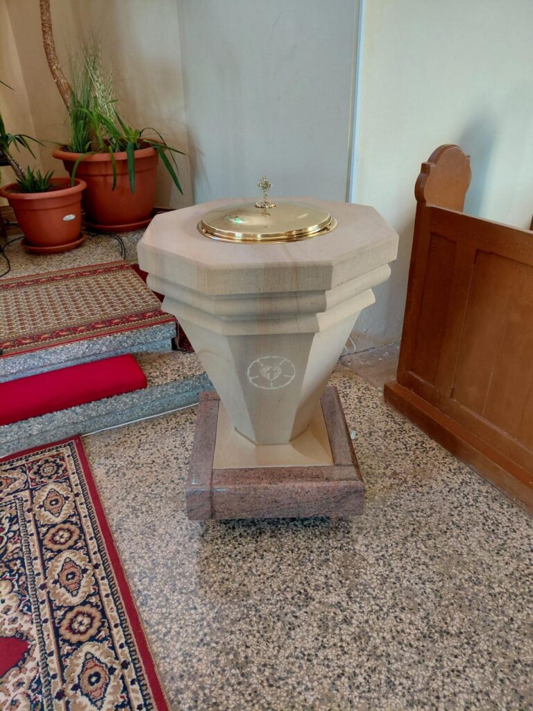Das GAW hat der Gemeinde im Projektkatalog 2020 mit 14.000 € geholfen, eine Toilette im Eingangsbereich zu installieren, den Treppenaufgang zur Empore zu erneuern und das Taufbecken zu sanieren.